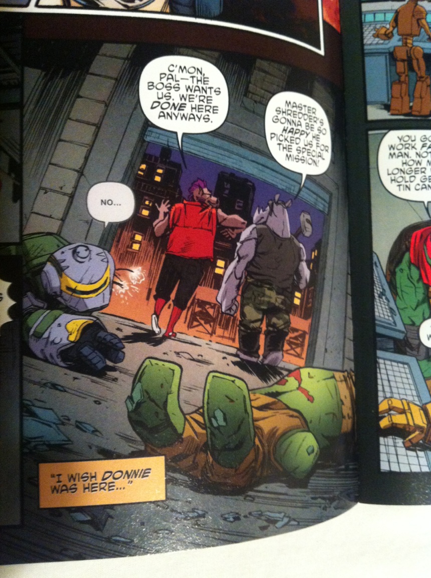 Word got out that it was a setup and Shredder instructed Bebop and Rocksteady to destroy the turtle! I know I skipped some stuff but honestly, who cares about other events in this issue besides the Donatello predicament?