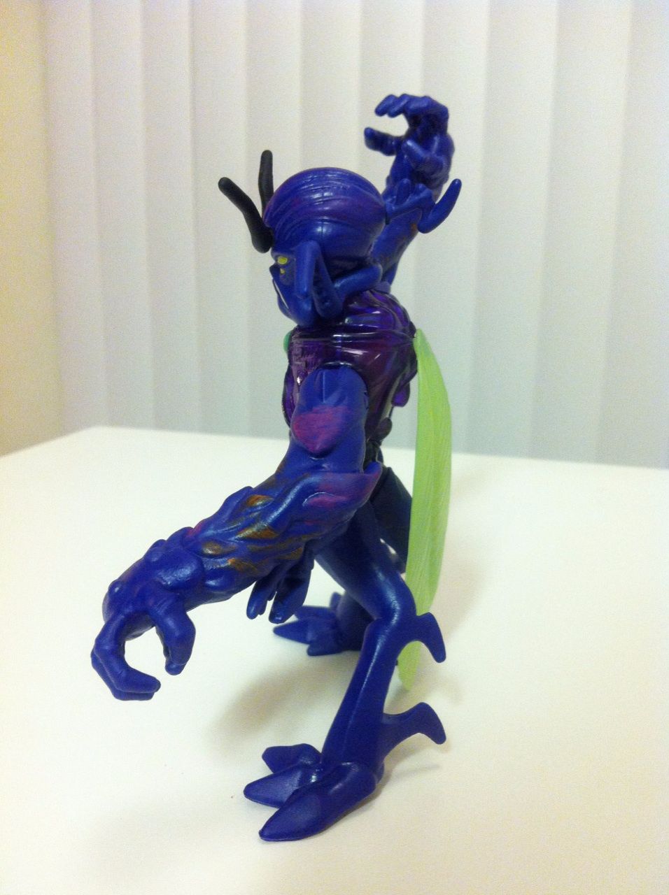 The bumps on Dregg’s hands were left unpainted, initially yellow on the prototype, along with the inner portions of the lower arm pinchers, which were silver in the early photographs. This look gives you an idea of how the wings swivel as well.